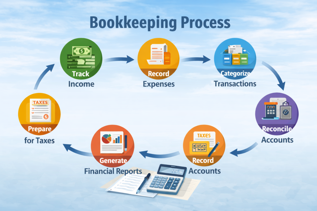 Bookkeeping is when you write down and organize all of the money transactions that your company makes. It helps businesses understand where they stand with their money and keep records.
