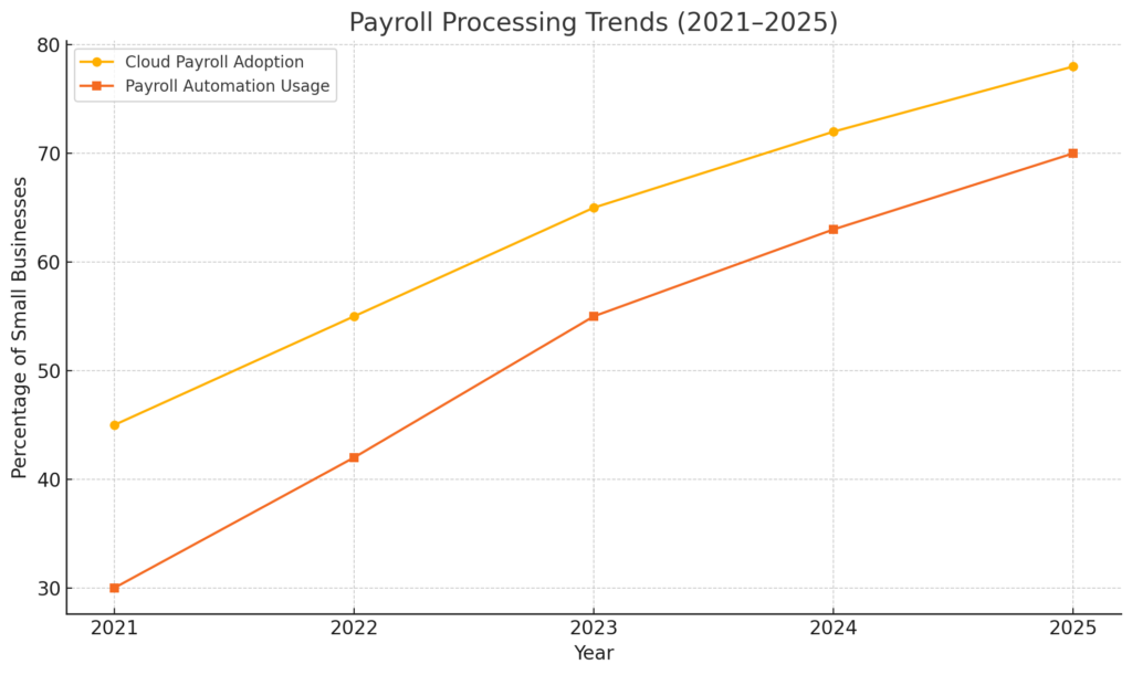 Here’s the updated graph showing payroll processing trends from 2021 to 2025. It illustrates the steady rise in cloud payroll adoption and automation usage among small businesses.